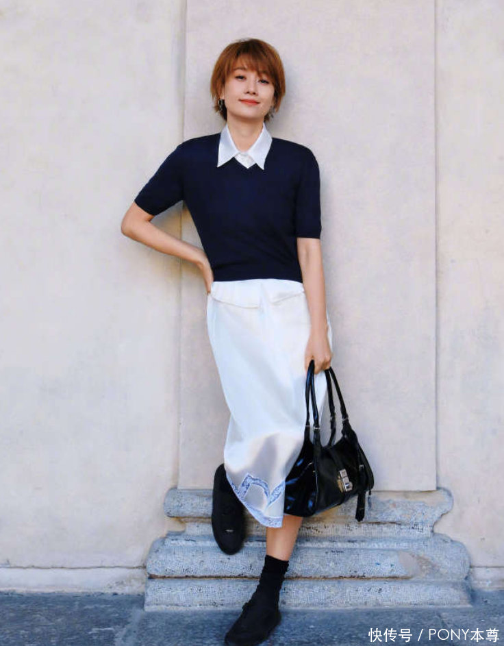 超短发的马伊琍,状态也很不错!棕色发色,搭配精致的妆容和蓝白色调的穿搭,时髦又个性!谁说时尚只属于年轻女孩儿!中年人也可以穿出摩登感!她把藏蓝色短袖针织衫,内搭一件白色缎面衬衫,搭配白色缎面半身裙,优雅又时髦!